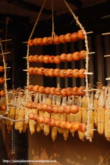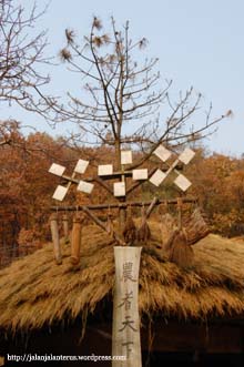 Di Korean Village ini kita bisa melihat bentuk rumah mereka yang atapnya terbuat dari jerami dan juga bisa masuk kedalam rumahnya yang unik dimana ruangannya ato tepatnya dibawah lantai ruangannya yang kayu tersebut terhubung ke dapur dimana disana ada semacam tungku sehingga jika dimusim dingin ruangan di kamar tetap hangat. Dan kamar laki-laki dan wanita terpisah. Dan jika suami istri ingin berhubungan maka istrinya harus masuk ke kamar laki-lakinya. Dan yang unik lagi diluar rumah digantung macam-macam hasil ladangnya seperti padi,gandum,jagung dan buah-buahan dan ada satu yang unik lagi ada gantungan tepatnya ukiran dari kayu yang menyerupai alat kelamin laki-laki alias p*ni* yang tidak hanya satu seperti gambar diatas yang konon kabarnya itu untuk mendapatkan anak laki-laki.