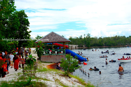 Keunikan dari danau yang bekas galian pasir ini yaitu di pasirnya yang berwarna putih layaknya pantai , tetapi airnya berwarna merah. Saat ini didanau yang tadinya hanya genangan air biasa telah disulap sebagai tempat wisata bagi warga Palangkaraya dsk, disini pengunjung bisa berenang di air merah dengan ditemani waterboom mini(tepatnya perosotan..heheh), trus ada sepeda air.