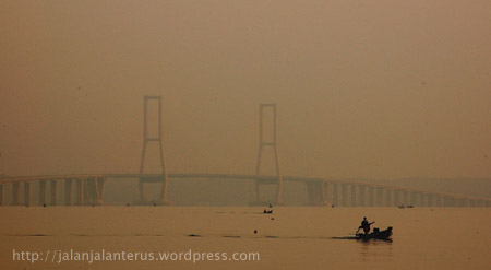 Posisi pantai Kenjeran yang berada di belahan utara kota Surabaya ini memang sangat cocok sepertinya untuk sunset dan sunrise spot, apalagi di pantai ini juga ada beberapa perahu nelayan yang ditambat. Dan di pantai ini juga disediakan pondok-pondok yang menjorok ke laut. O iya, ke lokasi ini juga tidak begitu jauh dari jembatan Suramadu itu, dan dari sini juga kelihatan jembatan megah tersebut dari kejauhan. Pas banget untuk posisi sunset dengan meng-siluetkan jembatannya darisini.