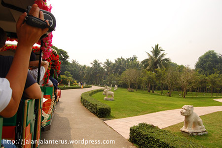 Dengan luasnya yang lebih kurang 30 hektar memang sangat tidak memungkinkan untuk mengelilinginya dengan jalan kaki, terutama jika disana sedang musim panas. Setelah pintu gerbang kita akan ditawari untuk mengelilingi taman ini dengan bus kereta. Dan menurut gw ini memang pilihan yang tepat untuk kita karena ternyata disini wahananya berupa bangunan-bangunan miniatur saja tidak seperti TMII yang mengadopt langsung bangunan aslinya.